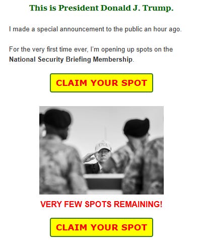 With the photo comes the following pitch from Trump: “For the very first time ever, I’m opening up spots on the National Security Briefing Membership. As a National Security Briefing Member, you’ll receive my private national security briefings, unfiltered updates on the threats facing America. The straight truth on border invasions, foreign adversaries, deep state sabotage, and every danger the fake news hides.”